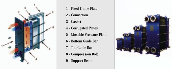 The plate heat exchanger consist of a series of thin corrugated plated that are assembled between a fixed frame plate and a movable pressure plate and compressed by tightening bolts. The number of plates is determined by the cooling surface required, the flow rate, physical properties of the fluids and their pressure drop. Connections are located in the frame plate or, in some applications, in the frame the pressure plates.